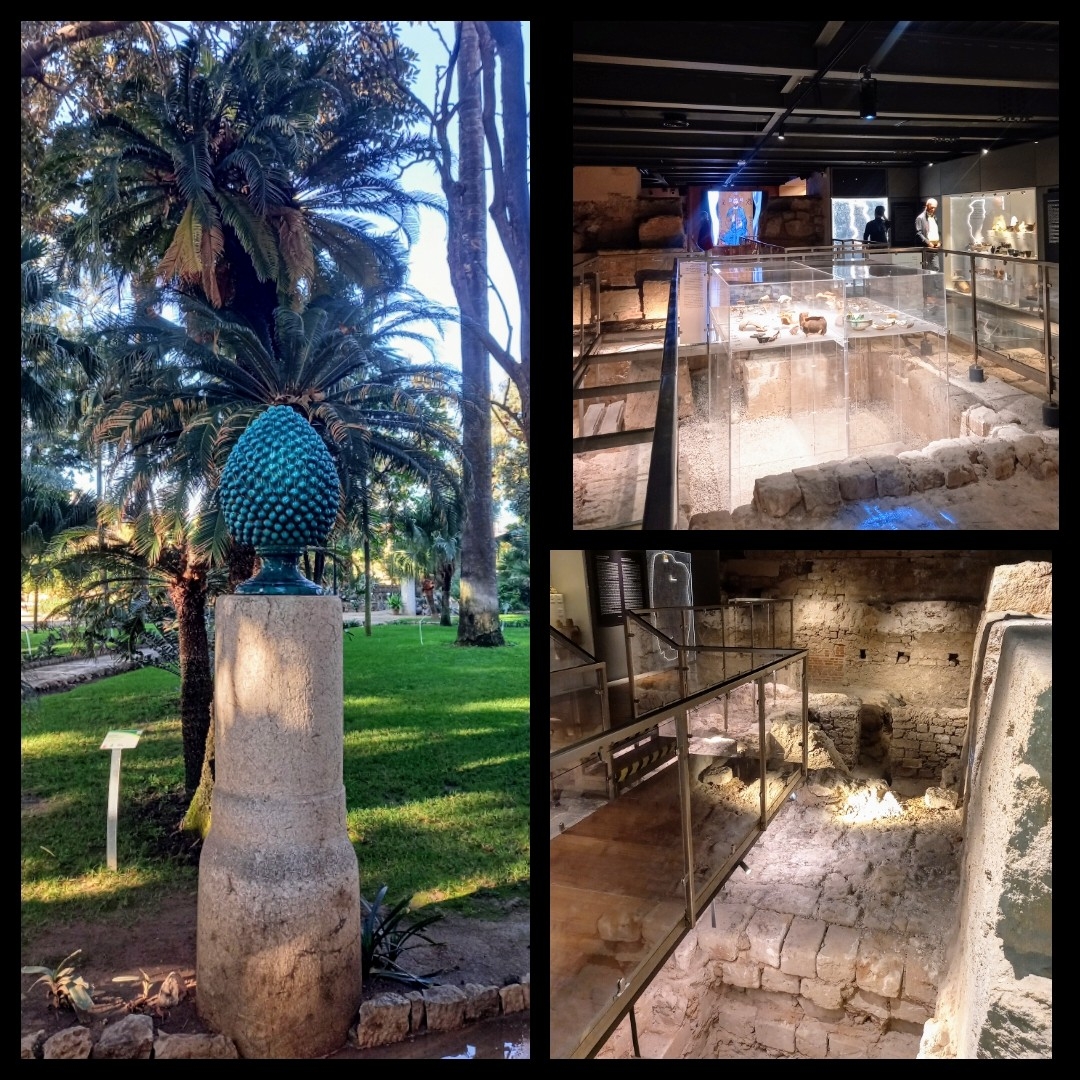 Palatsets trädgård med den typiska, sicilianska pinjekotten i keramik. I palatsets källare finns rester av den puniska stadsmuren och bosättningar.